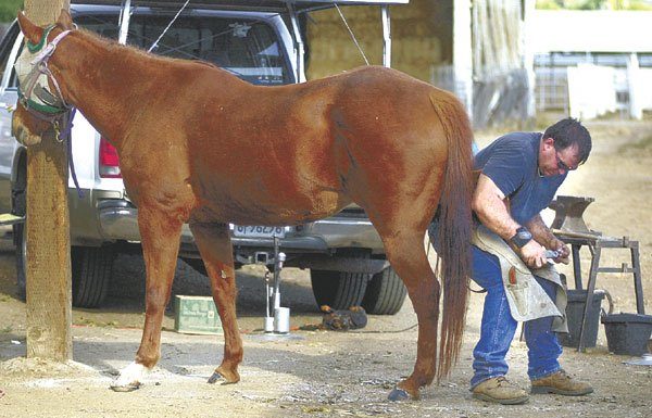 James McCracken files the hoof of a horse as it gets a set of