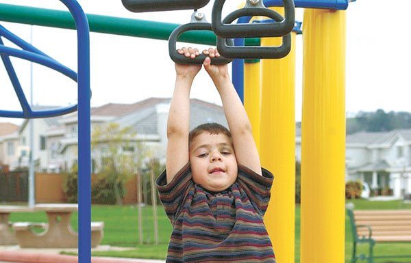 Miguel Gomez, 4, hangs out on the monkey bars in the playground