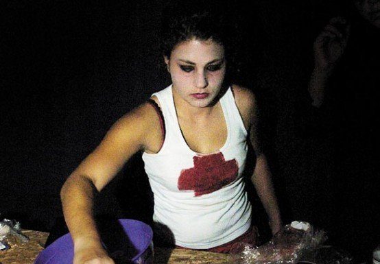Deena Morsilli, 16, pours fake blood over real pigs feet in the
